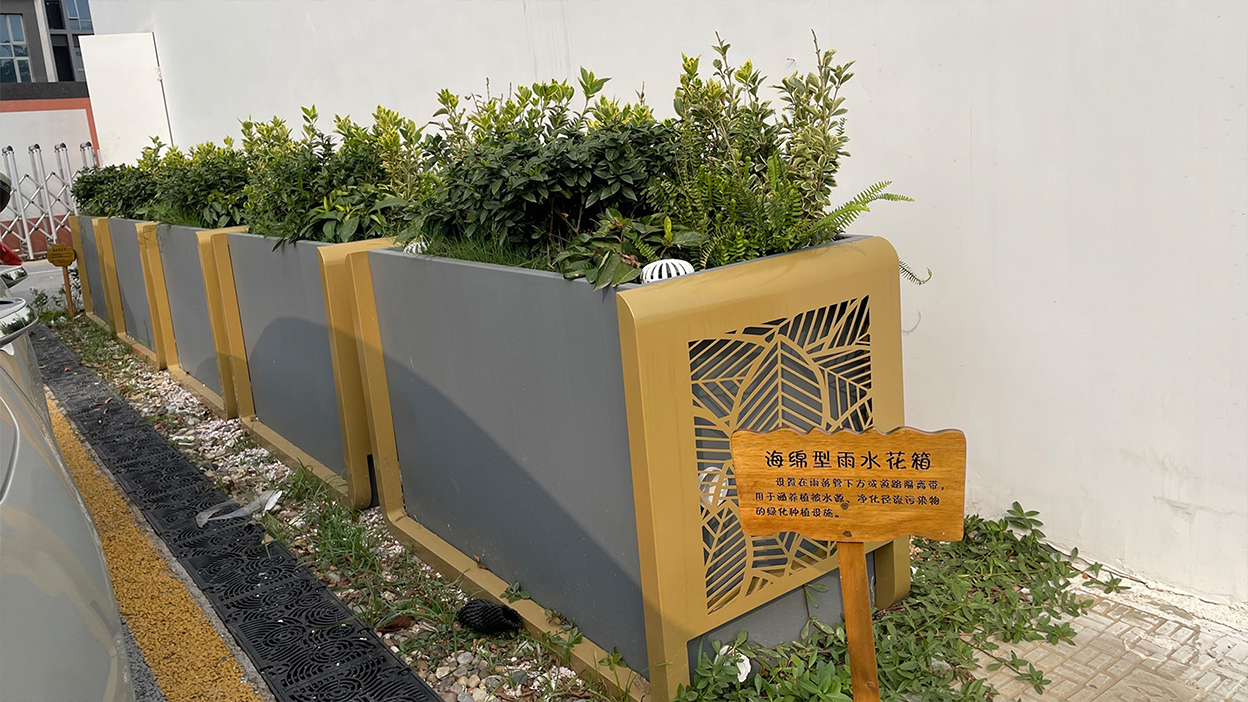 这是一款具备延时调节和净化功能的海绵型雨水花箱,一般配置在建筑物或高架桥的雨落管下方或市政道路隔离带。能够有效降低径流雨水中的污染物,雨水处理后可储存在花箱内部。该设施能削减城市径流污染,也作为绿化景观。并通过源头分散、慢排缓释来减少后续海绵设施和排水管网污染的负荷和维护工作。
